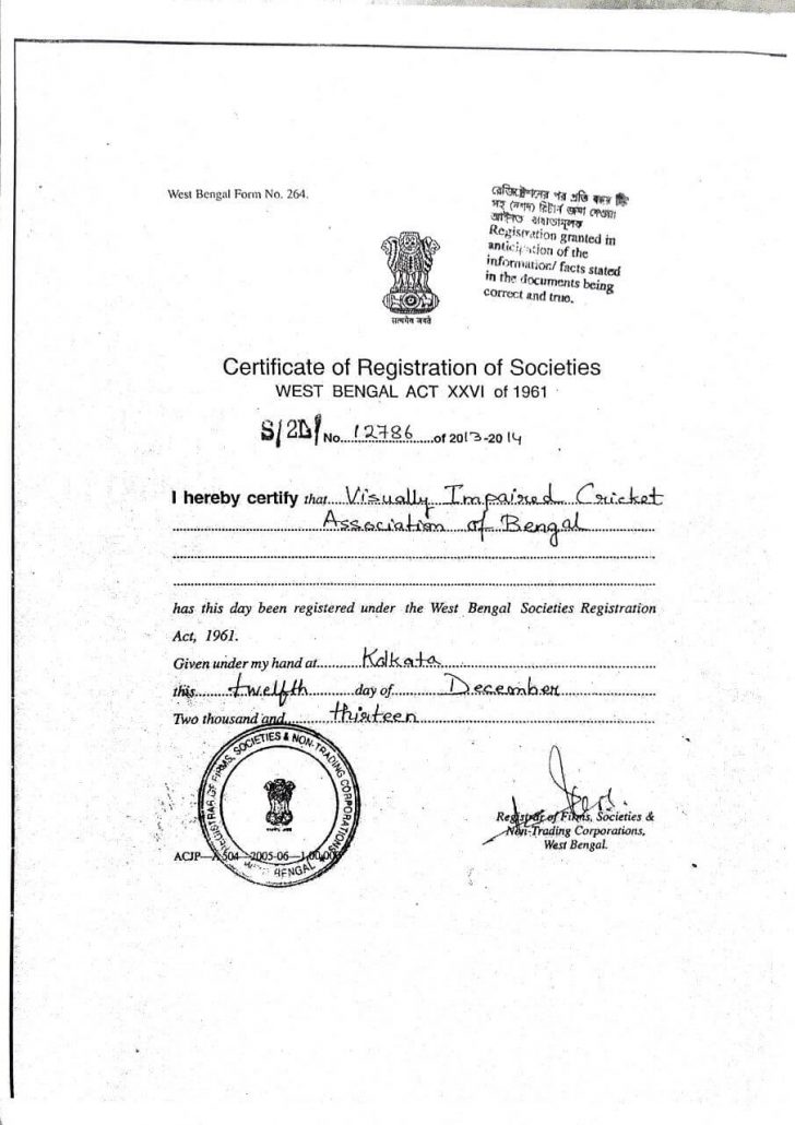This organization is working on cricket for blind person since last five years. Finally, we got our registration from societies registration act department of west Bengal govt. in 2013.